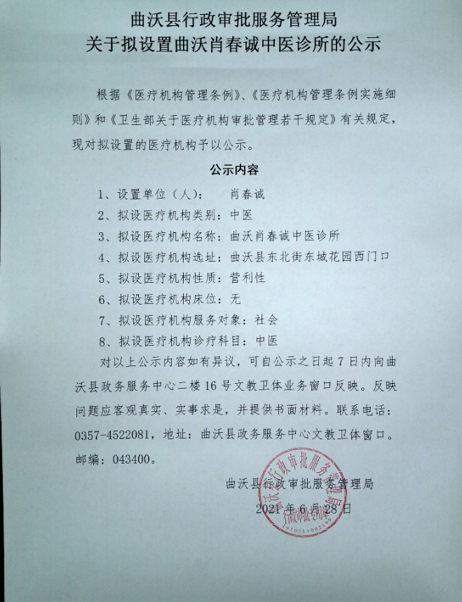 曲沃縣行政審批服務(wù)管理局 關(guān)于擬設(shè)置曲沃肖春誠(chéng)中醫(yī)診所的公示