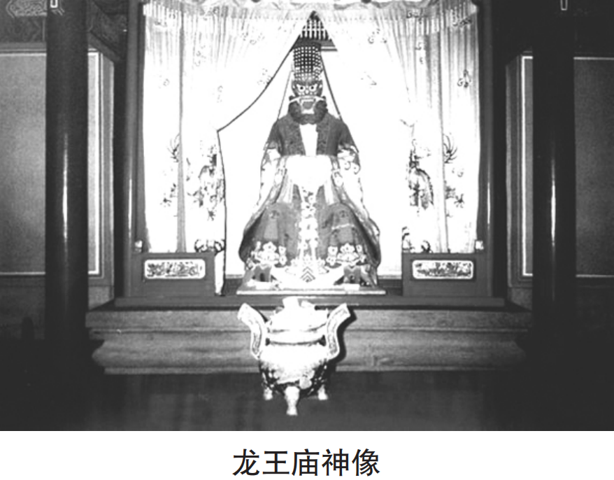 數(shù)日功夫,龍王廟建成了,它坐北向南,依山傍水,規(guī)模宏大,氣勢磅礴,廟中最北邊有正殿五間,前有獻(xiàn)殿三間,中有過廳五間,南有戲臺一座,戲臺兩邊建有東西兩個(gè)廟門,廟院中東西兩側(cè)還建走廊各十余間。龍王廟的正殿中有龍王爺塑像一座,中間兩根直通屋頂?shù)哪局嫌袃杀P木龍。建廟時(shí),人們沒有忘記退去洪水的青龍兄弟,便把它倆的像雕成木龍,纏繞在這兩根木柱上,同龍王爺一起享受人們的祭祀。大殿東西兩側(cè)還塑有雷、電、火、雨、風(fēng)、云、霧、雪八大金剛。塑像都有一人多高,身涂五彩,飄衣飛帶,威風(fēng)凜凜。