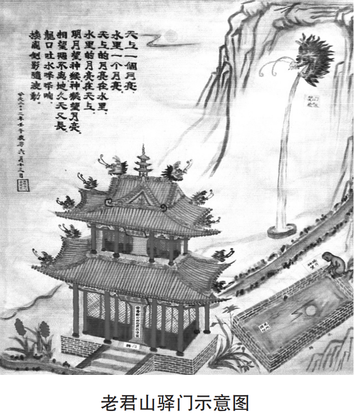 他從老君坡緩步而上,見這里山環(huán)水繞,風(fēng)景秀麗,心情十分愉悅??斓缴巾敃r(shí),眼前出現(xiàn)了一座閣樓式的大山門,有道士將他迎入閣樓內(nèi)落坐。吃過茶后,他要道士引他去朝拜太上老君,道士說:“要拜老君,須更衣洗面方能顯示誠意。”獻(xiàn)公隨即脫去戰(zhàn)袍、軍靴,換上素衣麻鞋,道士領(lǐng)他進(jìn)入山門,在一水池旁站下。道士先抬手指著不遠(yuǎn)處的一座土崖說:“主上請(qǐng)看那是什么?"