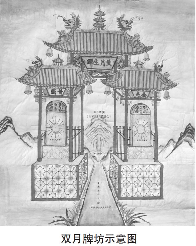 從此,那雙月牌坊只剩下亭中兩碑,中間那兩輪圓月被南蠻子盜走,再也不會放光了。