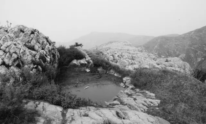 在山頂廟后不遠(yuǎn)處的峭崖下,有一汪水池,水池呈橢圓形,寬約數(shù)丈,清可見底。池雖不大,卻非常神奇,下不見泉眼,周不見水源,水從四周巖石縫隙中滲出,終年四季碧水盈池,不溢不虧。無論天有多旱,從未干涸,人們稱之為“天池”。