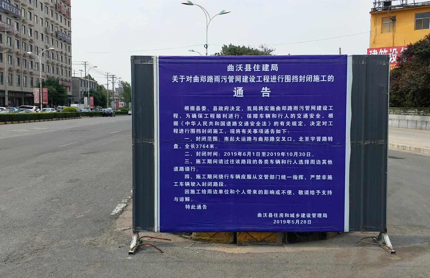 根據(jù)縣委、縣政府決定,我局將實施曲鄭路雨污管網(wǎng)建設(shè)工程,為確保工程順利進行,保障車輛和行人的交通安全,根據(jù)《中華人民共和國道路交通安全法》的有關(guān)規(guī)定,決定對工程進行圍擋封閉施工,現(xiàn)將有關(guān)事項通告如下: