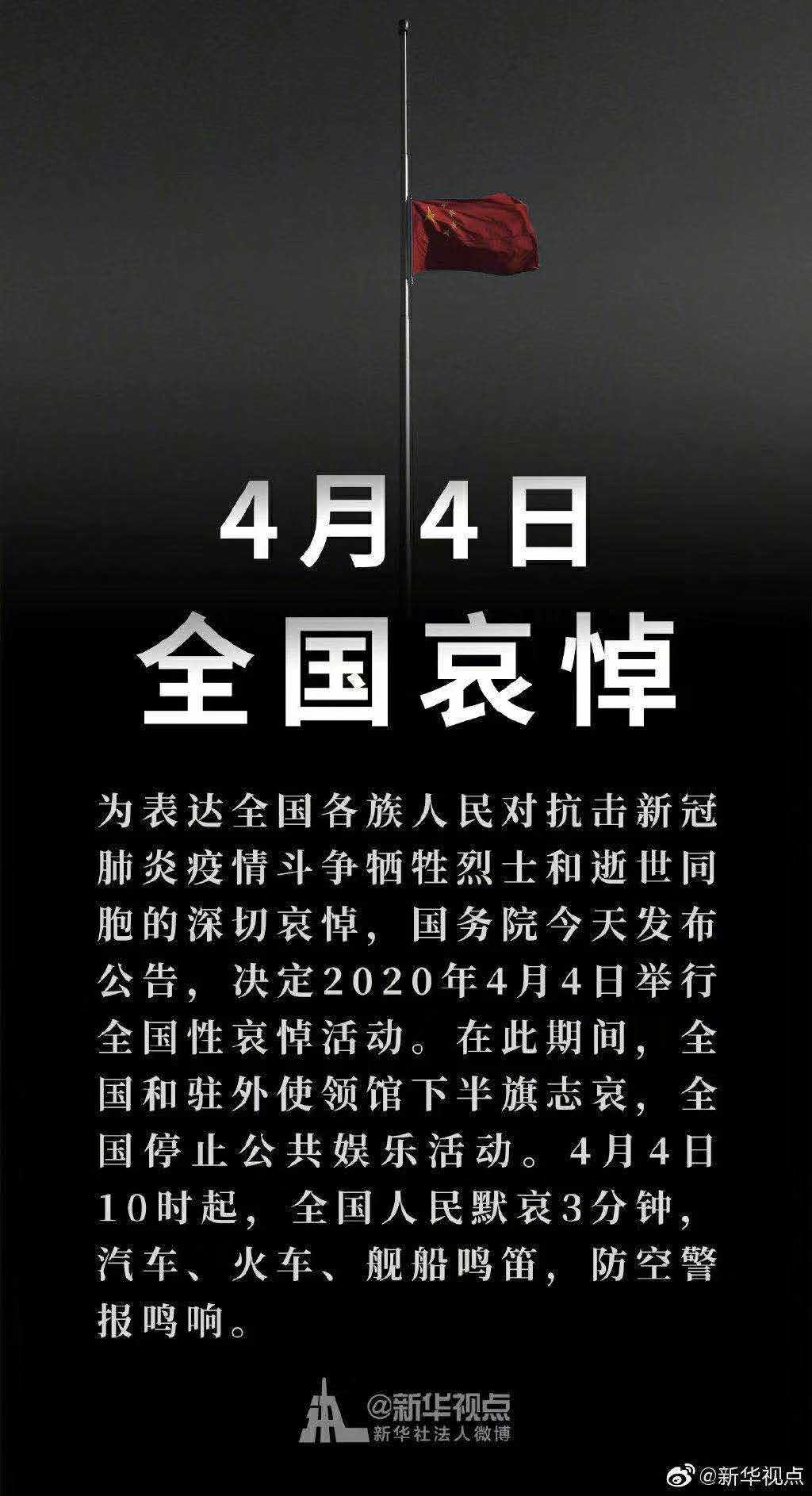 為表達全國各族人民對抗擊新冠肺炎疫情斗爭犧牲烈士和逝世同胞的深切哀悼,國務(wù)院決定,2020年4月4日舉行全國性哀悼活動。在此期間,全國和駐外使領(lǐng)館下半旗志哀,全國停止公共娛樂活動。4月4日10時起,全國人民默哀3分鐘,汽車、火車、艦船鳴笛,防空警報鳴響。